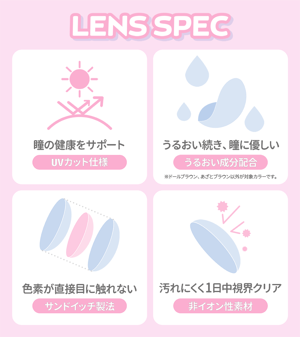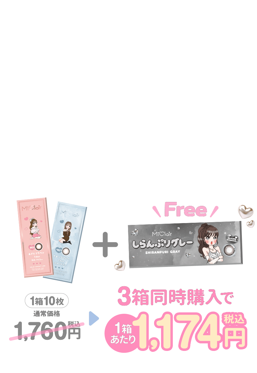 伊藤桃々(いとうもも)ちゃんプロデュース『MiClair』からシリコンレンズ登場! ぜったいに可愛くなれる♪どんなシーンでもそのトキの一番になれるこだわりデザイン 好みやシーンに合わせた、わがままな9カラー♡ 《しらんぷりグレー》【NEW】 甘さ控えめの絶妙グレー♡ 抜け感あるダークグレーとじゅわっとぼかしフチで自然に瞳に馴染んでナチュラルな仕上がりに。 《なまいきブラック》 ツヤっぽブラック×ダークグレーで子猫のようにきゅるんとした顔に 見惚れるほどの、罪な可愛さ爆誕♡ 《クルムグレー》 自然なサイズアップを叶える細フチに、光をまとって潤む水光グレー つけた瞬間、儚げ美女の瞳になります♡ 《かまってグレー》 しれっとデカ目の愛されグレー。太すぎず細すぎない!さりげなく盛れるサイズ。 クールで落ち着いた印象に、美しい目元に仕上げる。 《わがままピンク》 甘くとろける太フチピンクで愛らしい瞳を演出。 甘さを引き立てながら馴染みの良いピンクカラー。 《ドールブラウン》 小粒目さんでもしっかりサイズアップできる黒フチ×高発色ブラウン。 誰でもお人形さんみたいにくりっと可愛くなれる 《あざとブラウン》 太めフチ×ダークブラウンとベージュブラウンのきゅるん発色。 しっかり盛れて、あざとく可愛い女の子らしさの詰まった瞳 《すっぴんブラウン》 ぼかし黒フチと少し明るめブラウンが、自然なツヤっぽい瞳を演出。 ナチュラルだけど盛れる彼ウケ無敵の発色。 《パンプキンブラウン》 上品に発色するオレンジブラウンカラー。 デカく太フチで絶対的に盛れる。 中華系や韓国メイクにも相性抜群!