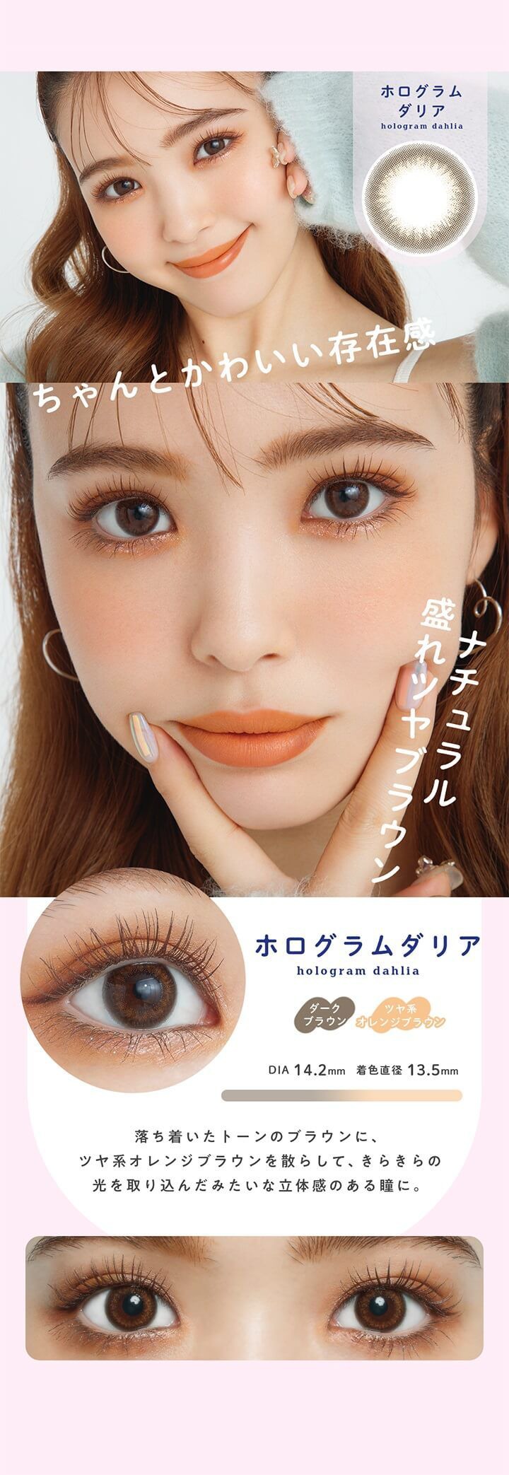 自分をアップデートできるようなカラコン「アプデ」新登場♪瞳をナチュラルに大きくするサイズで自然に盛れる!普段使いにもピッタリな6カラー。 《カルミアグレー》【NEW】イエベ、ブルベ関係なく馴染む絶妙うるツヤグレー《マンダリンビジュー》【NEW】うるキラブラウンが目元に光を閉じ込め、立体感を演出《シロップブラウン》 茶目にも黒目にもなじむ、うるふわナチュラルブラウン 《ウォーターカーキ》 色素薄めの垢抜けカラーになれるカーキ×ブラウン 《ドロップピンク》 肌なじみのいいピンクで甘い印象を与える瞳に 《ホログラムダリア》 立体感のある瞳を演出するオレンジ系ブラウン
