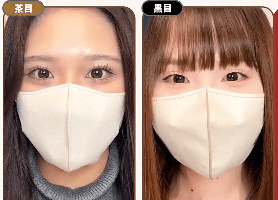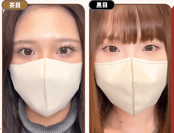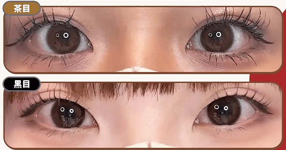 メロメロブラウンはピンク感が際立って、 涙目ブラウンは裸眼の茶色に近い赤みブラウン発色。