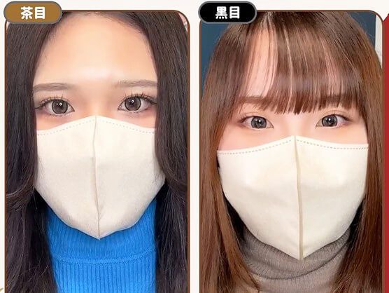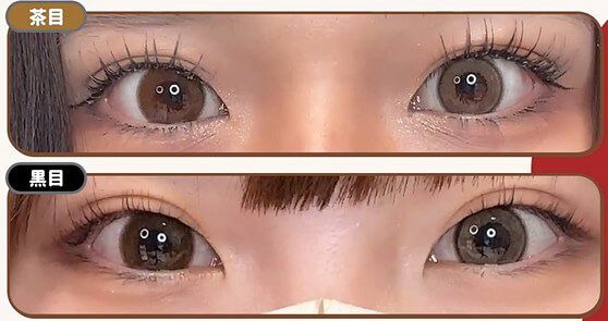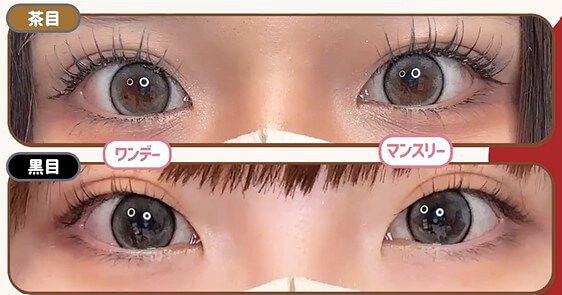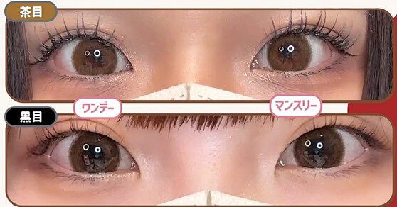 マンスリーはくすみ感がでて落ち着いた焦げ茶目っぽく、 ワンデーは黄みやオレンジみのあるブラウンで茶目っぽくトーンアップ♪ 体感サイズはマンスリー13.7~8mm、ワンデーは13.6~7mm。